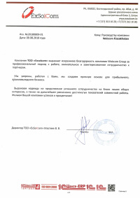 Компания ТOO «Exsolcom» выражает благодарность кампании Webcom Group за профессиональный подход к работе, внимательное и заинтересованное сотрудничество к партнерам.